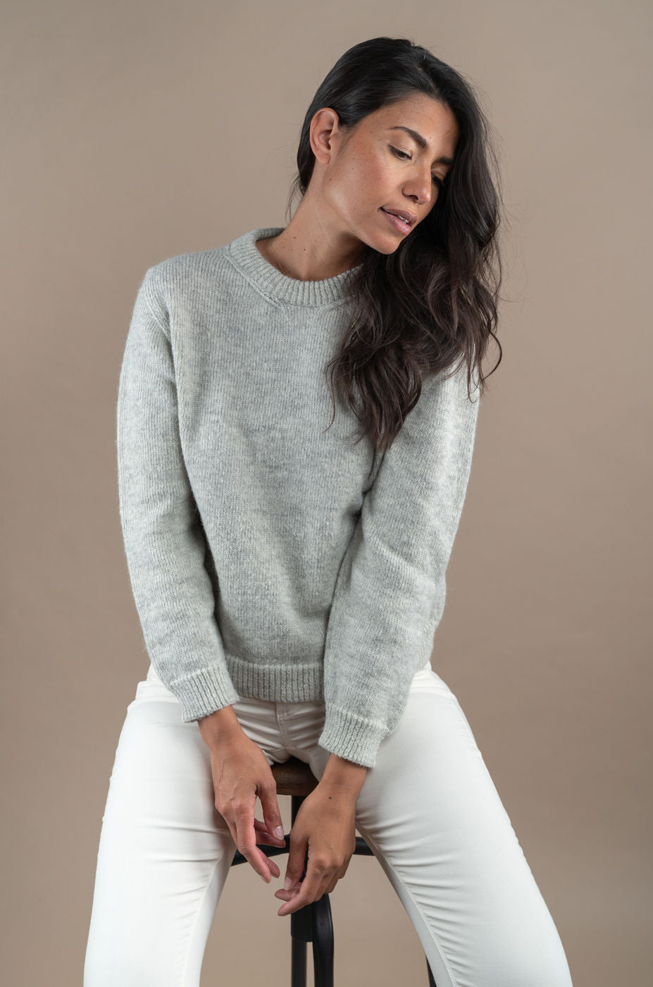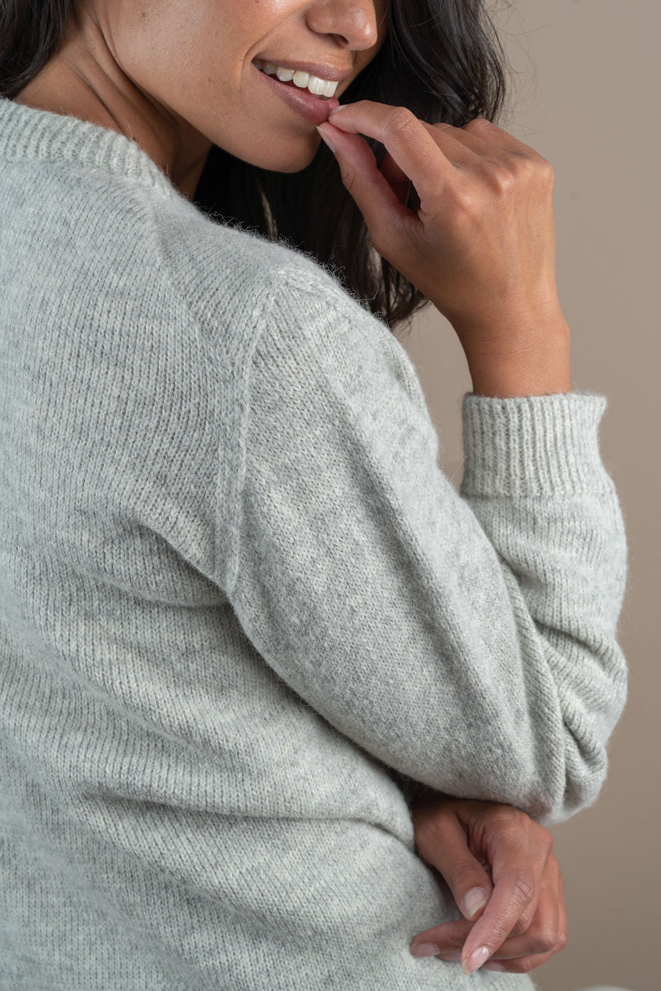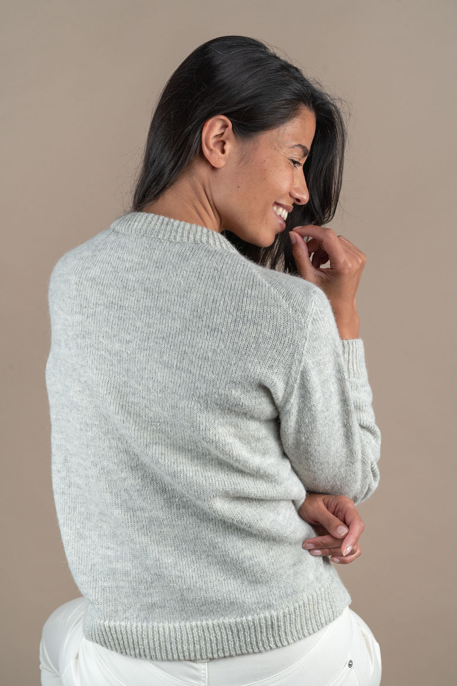 Amaryllis is a fine and cosy crew neck sweater in 100% baby alpaca. It has a hip length and a rib at the hem and cuffs. This sweater is handknitted in a mélange of soft light grey and cloudy white. Model is 178 cm and is wearing M.