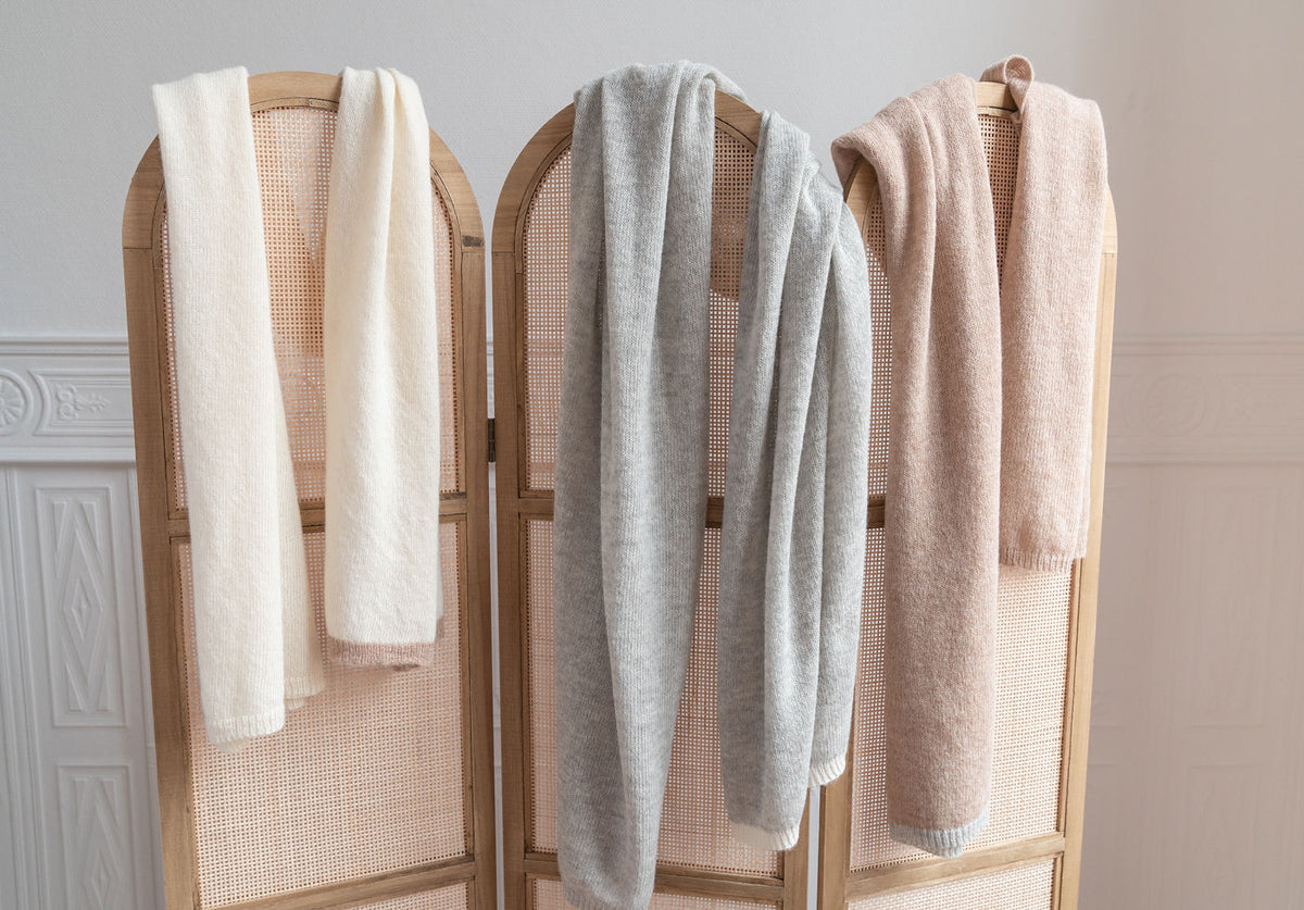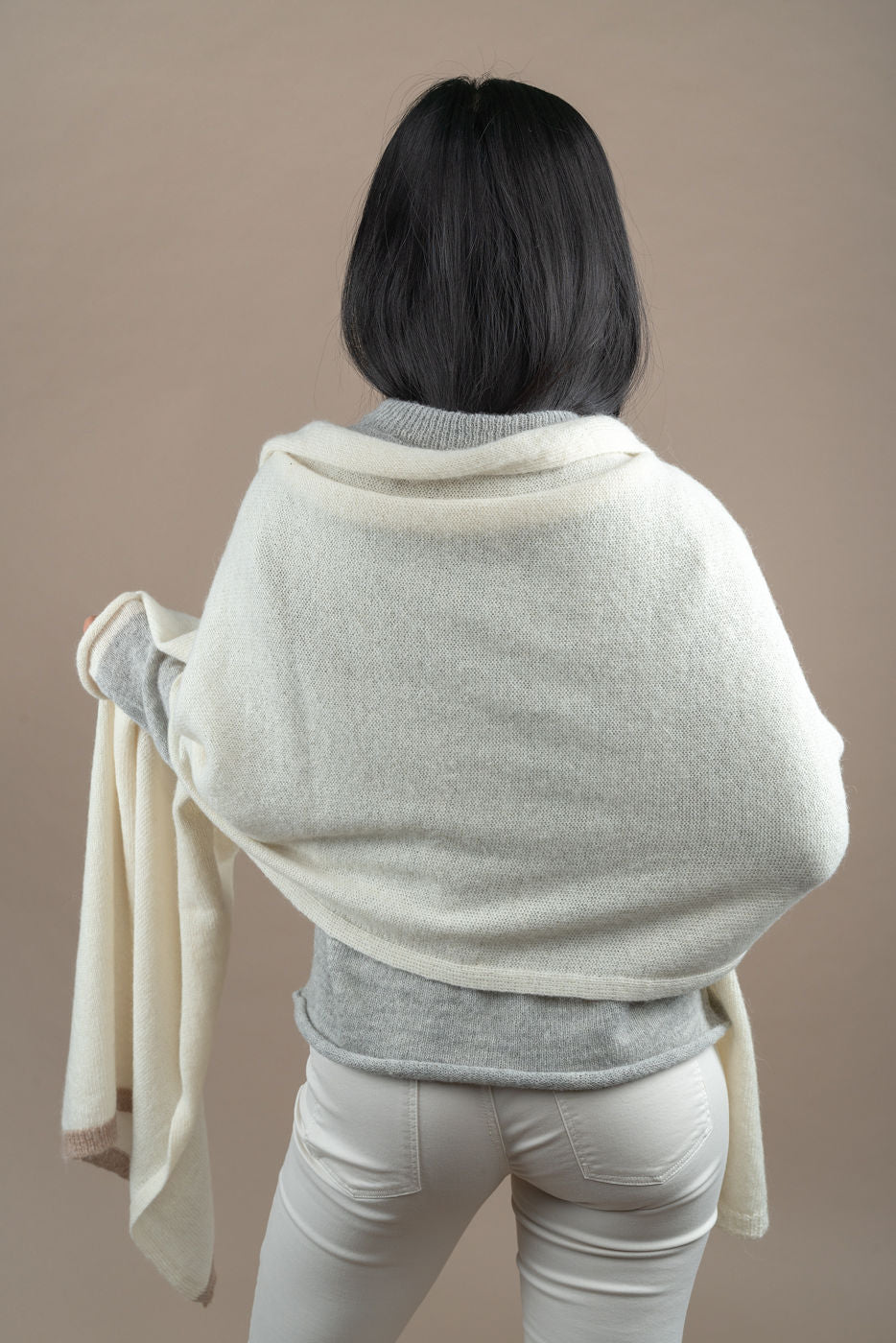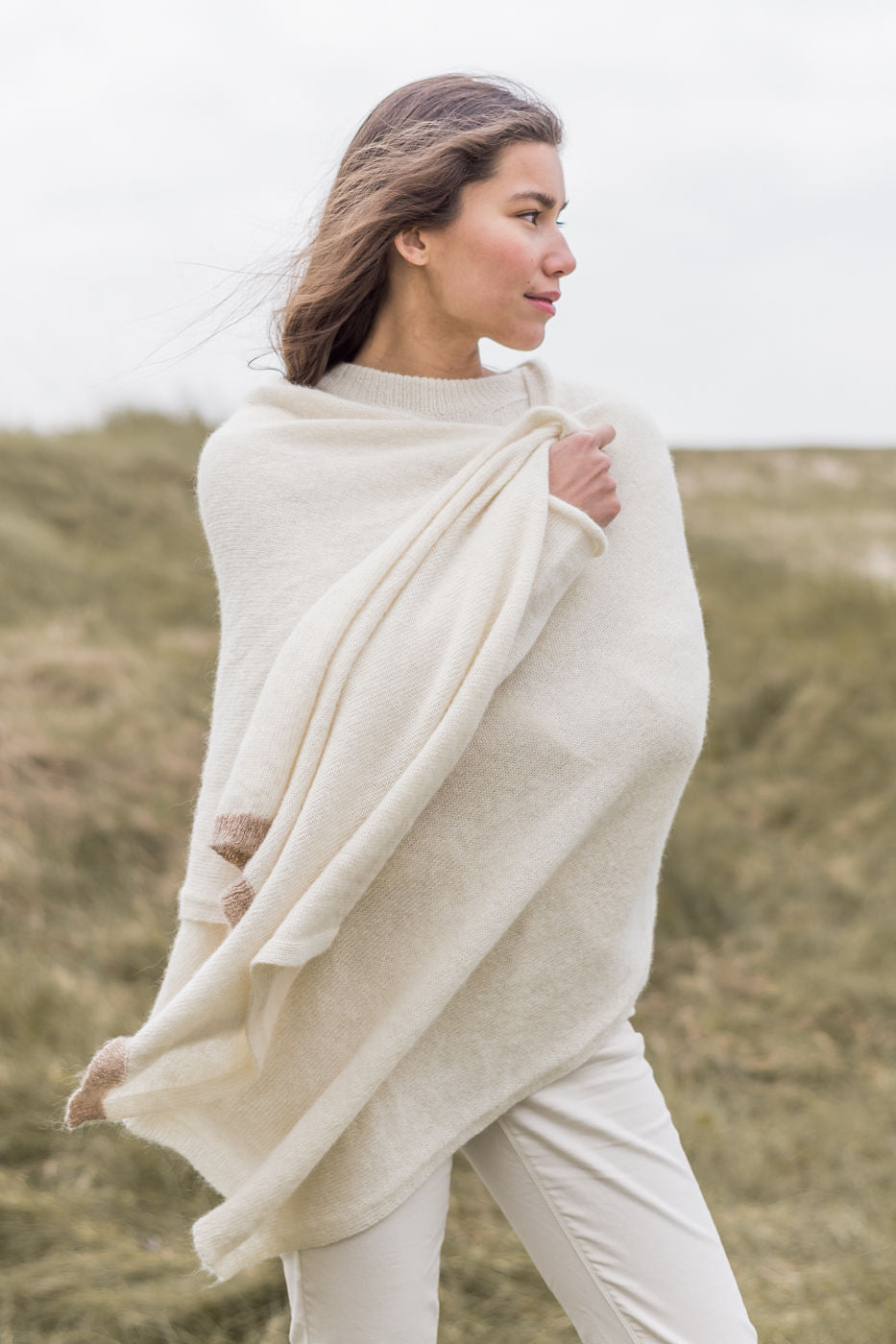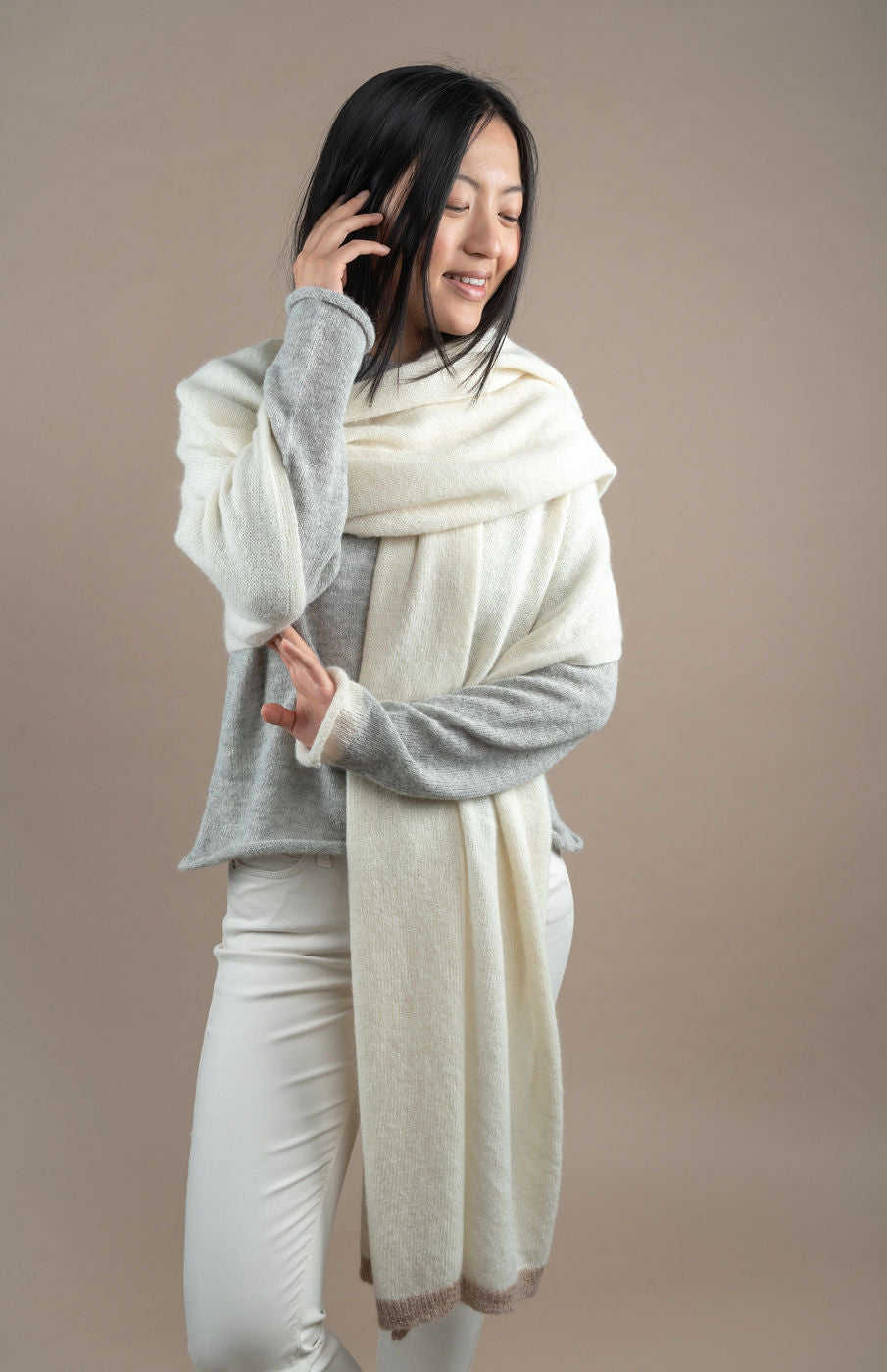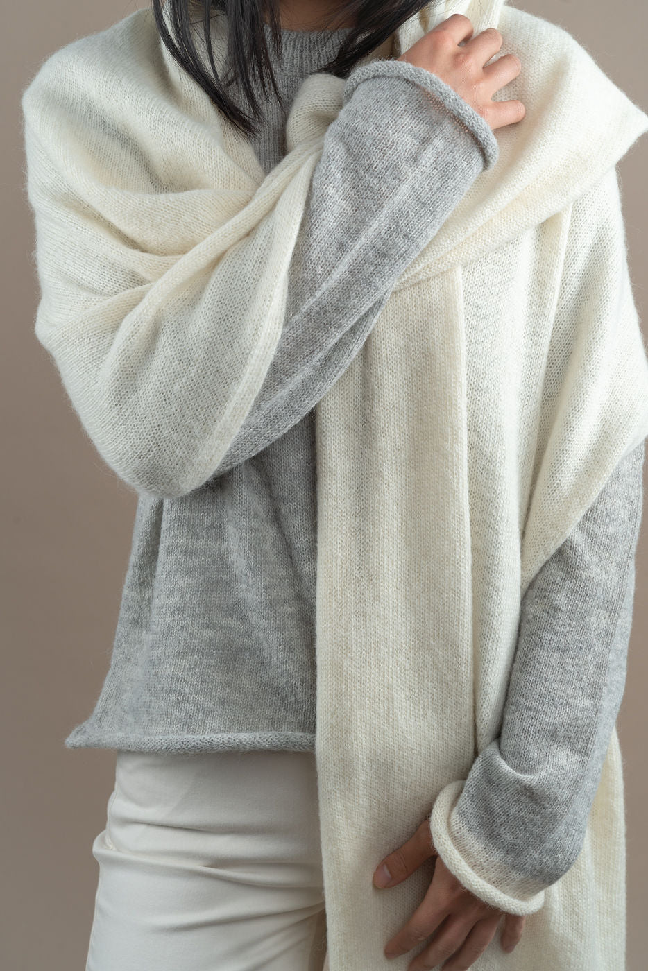Zakira is a lightweight scarf you can ware every season. This scarf goes with any outfit. Little detail : one hem is in a matching colour. 100% baby alpaca. Handmade. 275 gram. 200 cm x 70 cm.