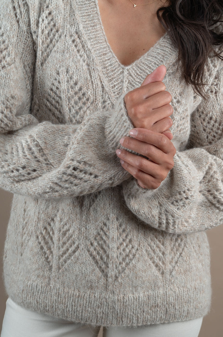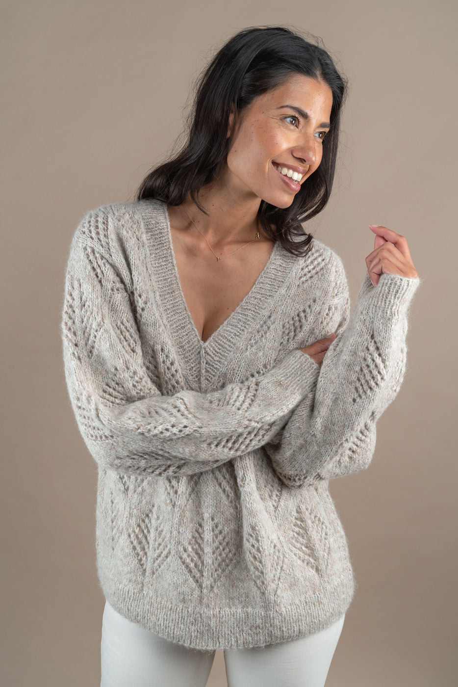 Ada sweater is a v-neck sweater in 100% baby alpaca. Ada is handknitted in a beautiful pattern and a mélange of pure natural white, grey and sand yarns. The V-neck is very feminin and elegant. Model is 178cm and wears L.