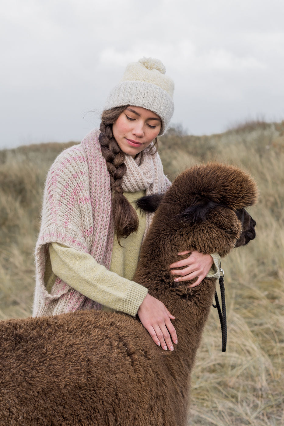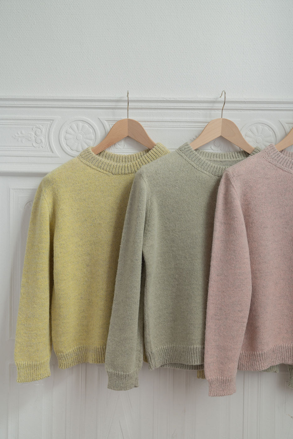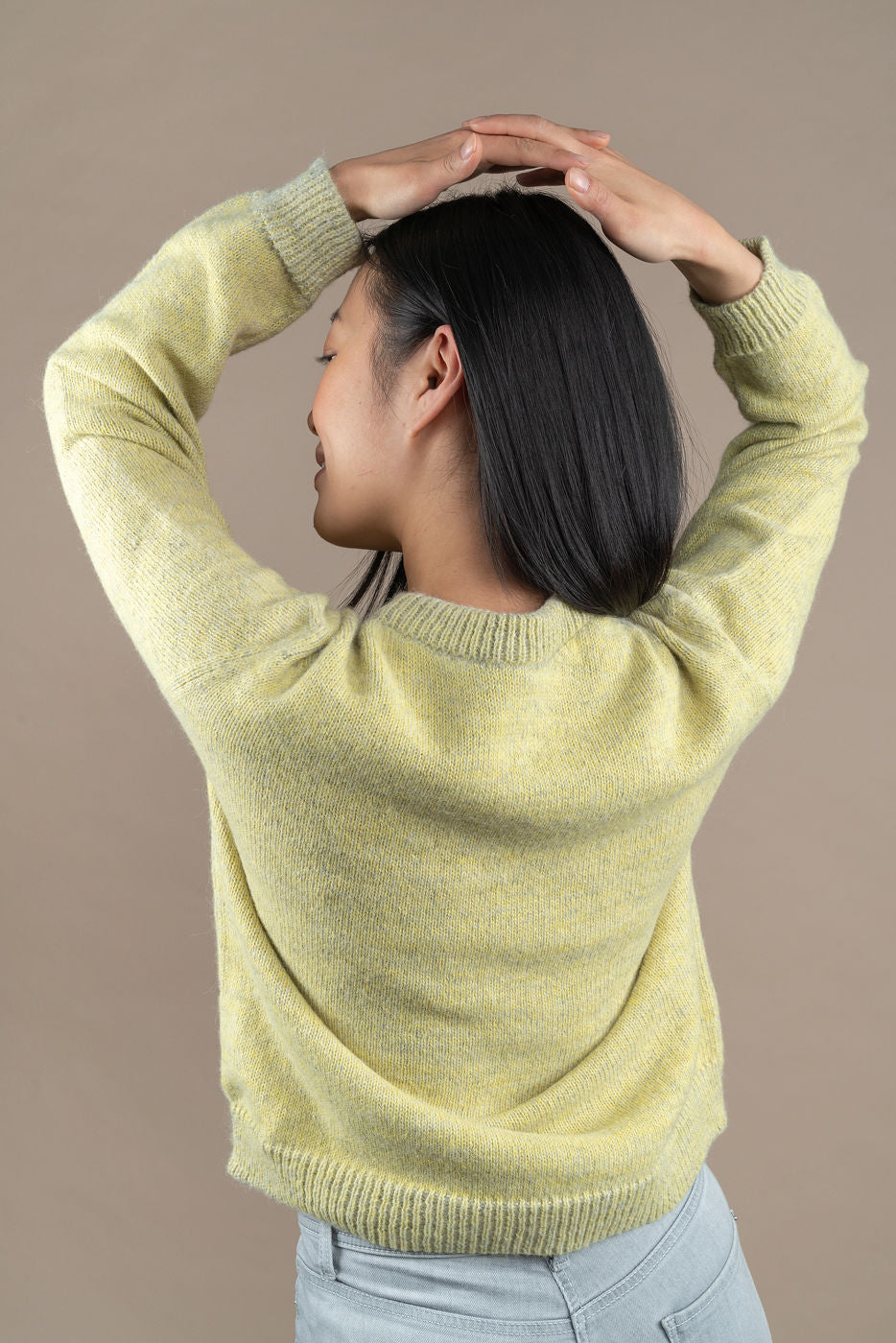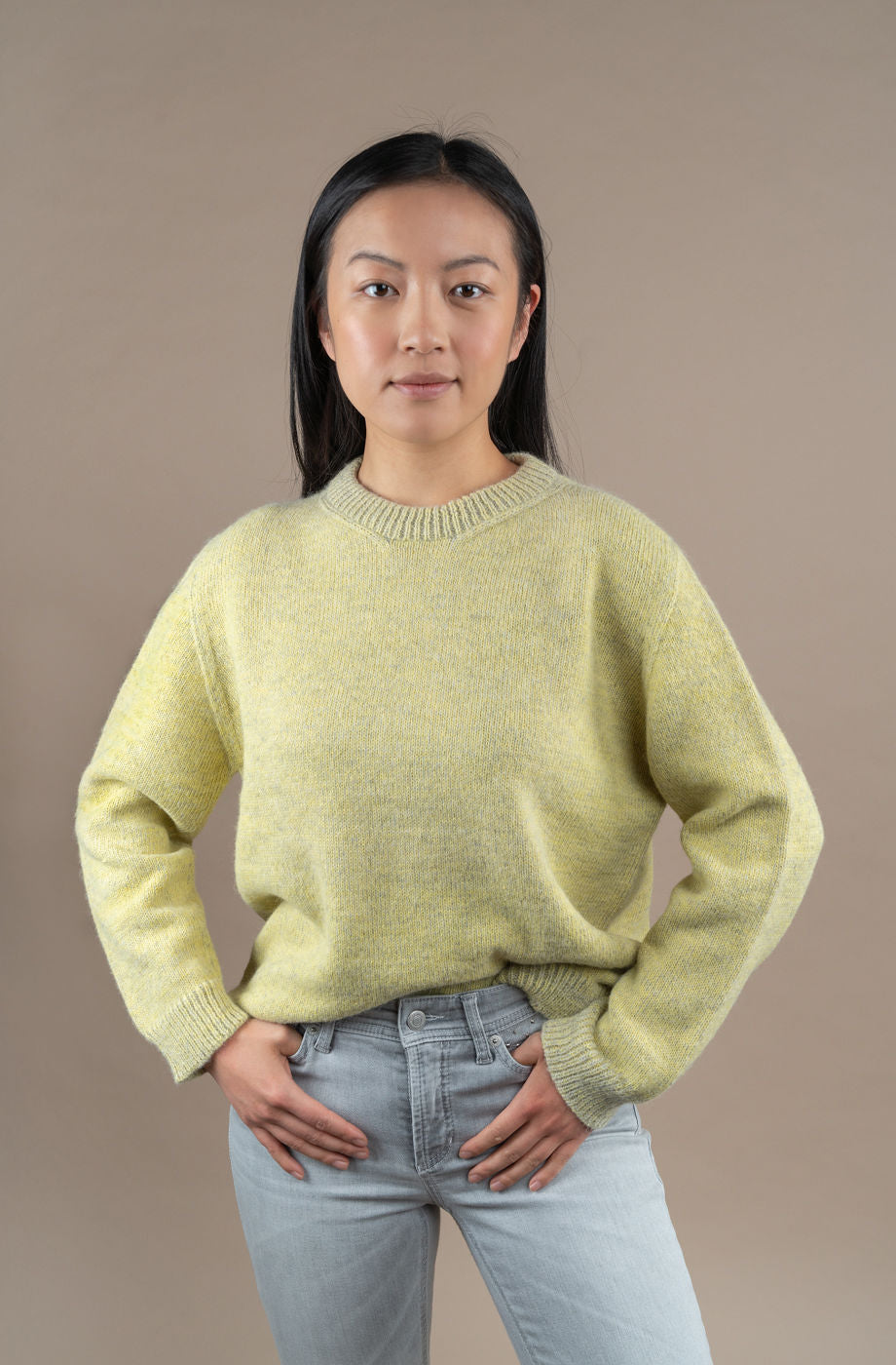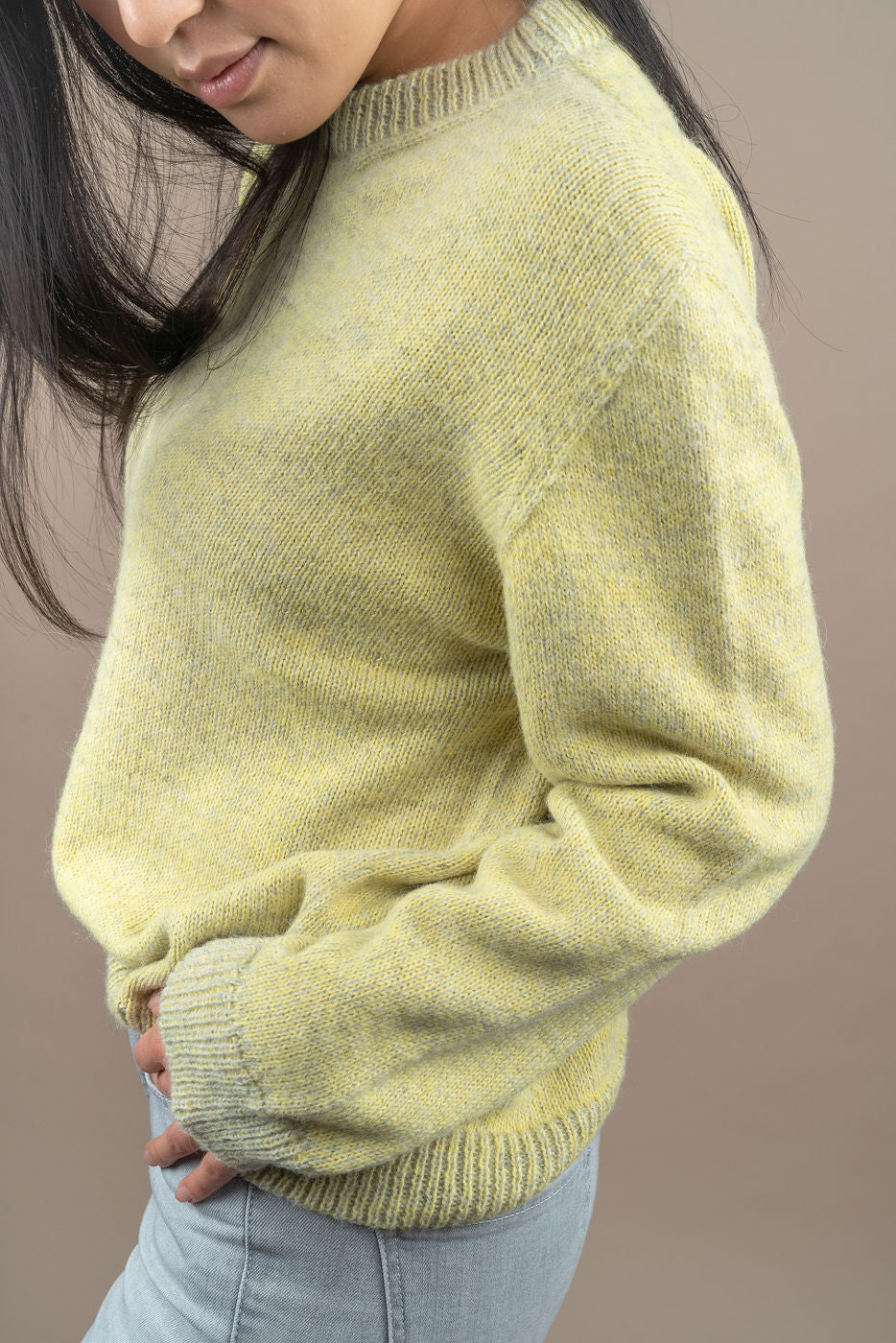 Amaryllis is a fine and cosy crew neck sweater in 100% baby alpaca. It has a hip length and a rib at the hem and cuffs. This sweater is handknitted in a mélange of warm yellow and light grey. Model is 168cm and is wearing M.