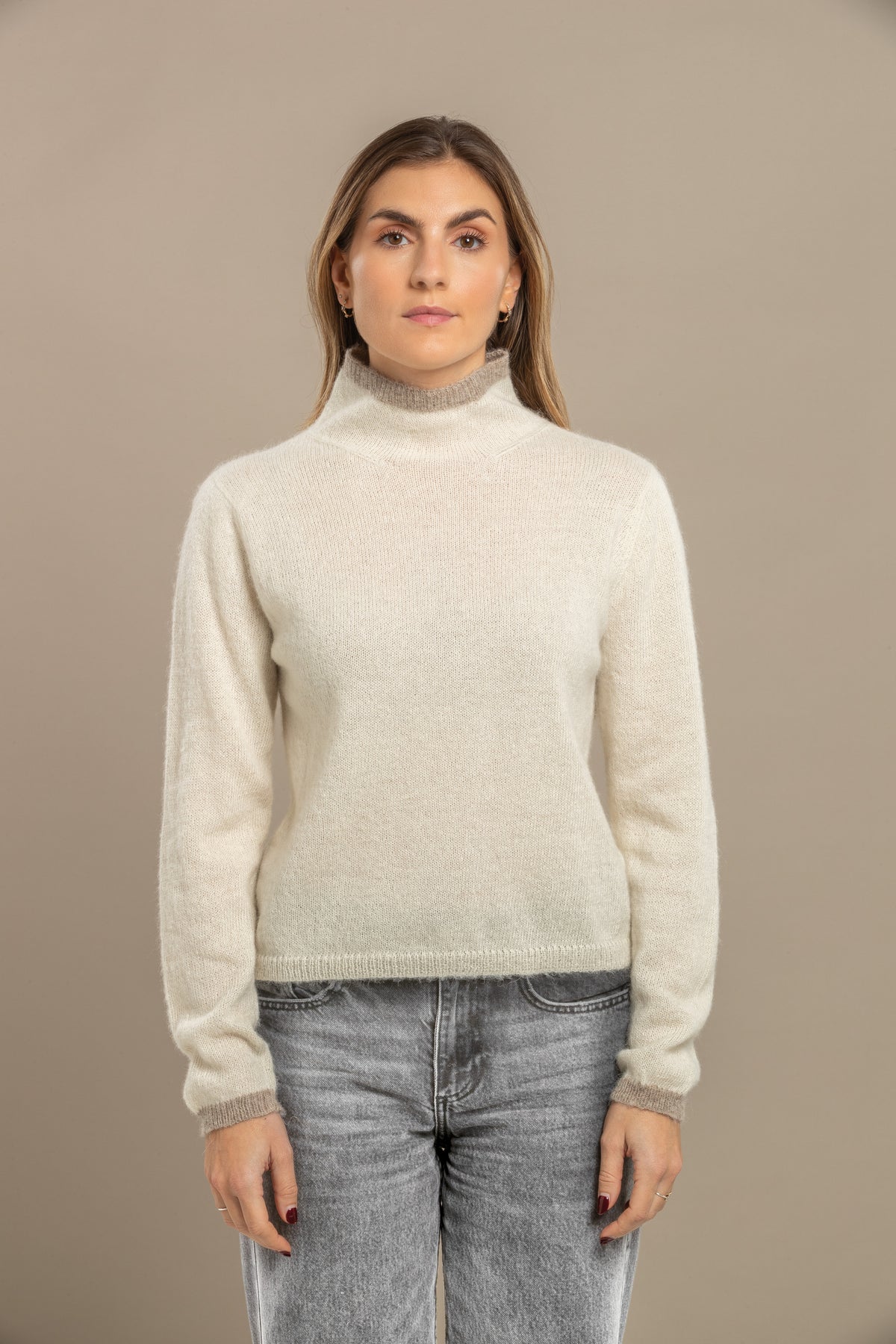 Dune is een zeer lichte trui met hoge hals. De zoom bij de hals en de rib bij de mouwen zijn in een contrasterende kleur. 100% baby alpaca. Handgemaakt. Het model is 170 cm lang en draagt maat S. De maat valt normaal.